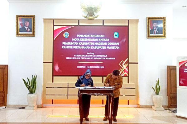 MAGETAN | NARASINFO.ID – Pemerintah Kabupaten Magetan resmi menandatangani kesepakatan kerja sama dengan Kantor Agraria dan Tata Ruang/Badan Pertanahan Nasional (ATR/BPN) Kabupaten Magetan dalam bidang pertanahan melalui pola Trijuang. Penandatanganan berlangsung di Gedung Pertemuan Surya Graha Magetan, Kamis (18/12/2025). Bupati Magetan Nanik Endang Rusminiarti dalam sambutannya menegaskan bahwa kerja sama tersebut merupakan langkah strategis dalam…